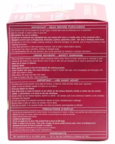 Protective Pre-Treatment: Aqua (Water) , Trideceth-2 Carboxamide MEA , Cetereth-25 , Hexadimethrine Chloride , Polyquaternium-22 , Conditioning Relaxer Cream: Aqua (Water) , Calcium Hydroxide , PEG-75 Lanolin , Ployqauternium-6 , propylene glycol , Liquid Activator: Aqua (Water) , Guanidine Carbonate , xanthan Gum , Sorbitol , Denatonium Benzoate , Cl 16035 (Red 40) , Neutralizing Shampoo: Aqua (Water) , Cocamidopropyl Betaine , Sodium Laureth Sulfate , Cocamide MEa , potassium sorbate , Polyquaternium-7 , Sodium PCA , Hydroxypropyl Trimonium Honey , Hydroxyisohexyl 3-Cyclohexene Carboxaldehyde , Phenolsulfonephthalein , Reconstructor Treatment: Aqua (Water) , Polyquarternium-37 , Propylene Glycol Dicaprylate , Dicaprate , Behentrimonium Methosulfate , PPG-1-Trideceth-6 , Stearyl Dimethicone , Hydrolyzed Wheat Protein , Leave-In Strengthener: Aqua (Water) , Oleth-20 , Polyquaternium-6 , phenoxyethanol , panthenol , Butylphenyl Methylpropional , Citric Acid , Citronellol , Benzyl Salicylate , Citral , Oil Moisturizer: Aqua (Water) , Paraffinum Liquidum (Mineral Oil) , glycerin , Petrolatum , cetearyl alcohol , PEG-100 Stearate Glyceryl Stearate , polysorbate 20 , dimethicone , Paraffin , fragrance , Dicetyl Phosphate , Ceteth-10 Phosphate , Methylparaben , triethanolamine , Ethylparaben , Cocos Nucifera Oil (Coconut) , Disodium EDTA , Laureth-4 , Laureth-23 , limonene , Hexyl Cinnamal , Chlorhexidine Dihydrochloride , Hydroxypropyltrimonium Hydrolyzed Wheat Protein , Linalool , Alpha-Isomethyl Ionone , benzyl alcohol , Geraniol , Coumarin , CI 19140 (Yellow 5) , Amyl Cinnamal , 2-Oleamido-1,3-Octadecanediol , CI 14700 (Red 4) , CI 17200 (Red 33) , CI 42090 (Blue 1).